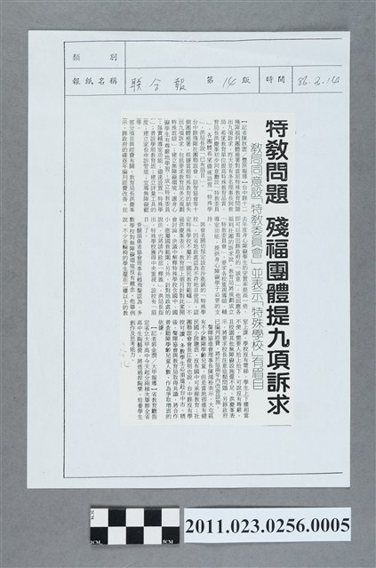 2011.023.0256.0005 聯合報86年2月14日第14版「特教問題 殘福團體提九項訴求」