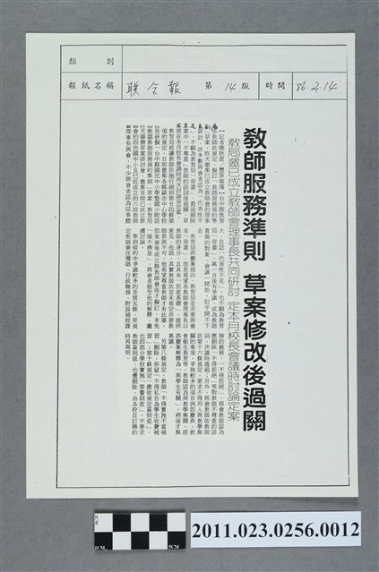 2011.023.0256.0012 聯合報86年2月14日第14版「教師服務準則 草案修改後過關」