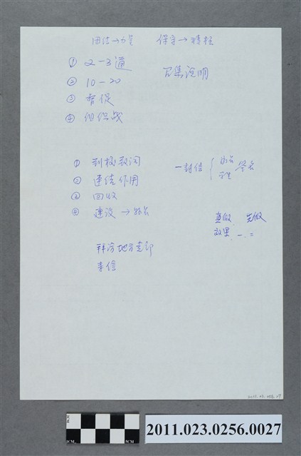 洪慶峰1997年提名登記參選國民黨臺中縣長候選人之電話訪談問卷,訪談問題為:「您最希望台中縣政府為您做什麼事情?」署名「洪慶峰縣長競選後援會」。背面有記事,由洪慶峰書寫,記錄執行選戰的想法,如團結→力量、保守→積極、到校致詞等。