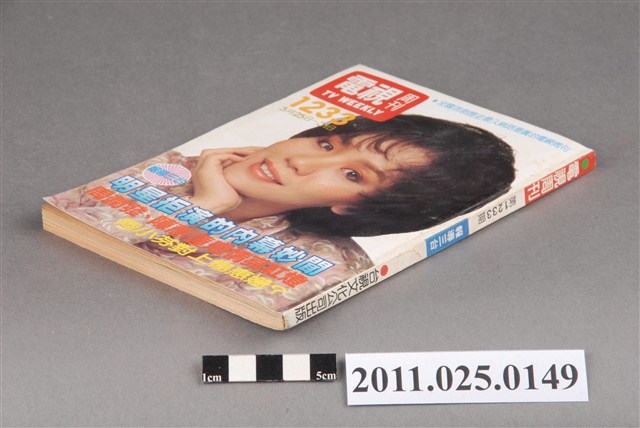 1.本物件為電視周刊TTV WEEKLY第1233期,封面照片為明星王芷蕾。由物件正面可見「電視周刊TTV WEEKLY 第1233期」、「5月25日-5月31日」字樣。其目錄章節可見包括「影視焦點」(如:明星拒演內幕趣聞)、「明星熱線」(如:王芷蕾有了傾訴心曲的對象)、「節目快報」(如:台視金色山莊排出鑽石陣容)、「綜合專欄」(如:讀者論壇)。該周刊內頁亦可見刊物發行所為台視文化事業公司,地址為臺北市八德路三段二號)。