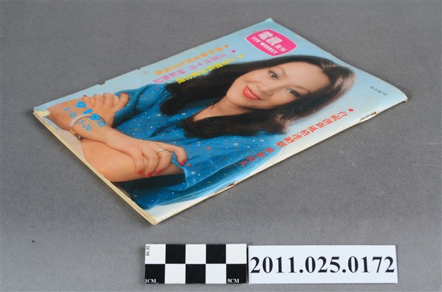 1.本物件為電視周刊TTV WEEKLY第919期,封面照片為明星汪萍。由物件正面可見「電視周刊TTV WEEKLY 第919期」、「5月18日-5月24日」字樣。其目錄章節可見包括「彩色之頁」(如:盲女神龍 江明苗可秀精彩對手戲)、「專題報導」(如:張琍敏生活在繽紛的花花世界裡)、「節目特寫」(如:在歡樂中傳遞知識的三百六十行)、「專欄」(封面人物 汪萍扮演三百六十行)。該周刊內頁亦可見刊物發行人為劉侃如,發行所為台視文化事業公司,地址為臺北市八德路三段二號)。