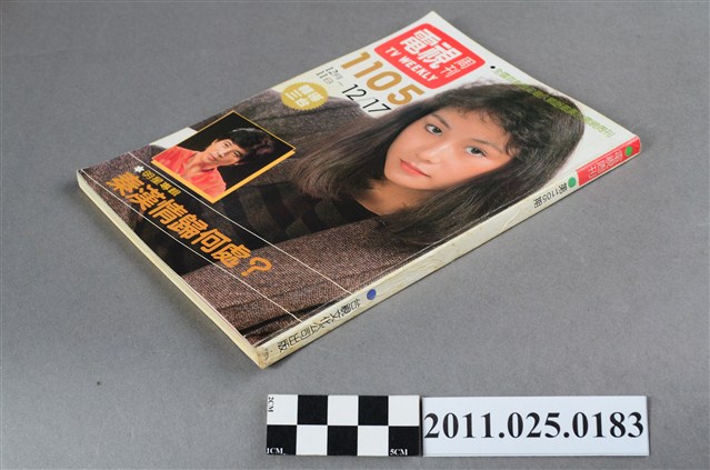 1.本物件為電視周刊TTV WEEKLY第1105期,封面照片為明星劉嘉芬。由物件正面可見「電視周刊TTV WEEKLY 第1105期」、「12月11日-12月17日」字樣。其目錄章節可見包括「特別報導」(如:台北又將吹起鄧麗君旋風)、「電視論壇」(如:從聯播節目展望公共電視)、「三台節目焦點」(如:台視晚間國語連續劇法槌)、「綜合專欄」(如:看電視談電視 亞太影展請在晝間重播)、「人物專訪」(如:王淑娟閃電結婚告別螢幕)、「彩色之頁」(如:明星周曆 鳳飛飛)。該周刊內頁亦可見刊物發行所為台視文化事業公司,地址為臺北市八德路三段二號)。