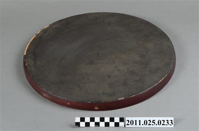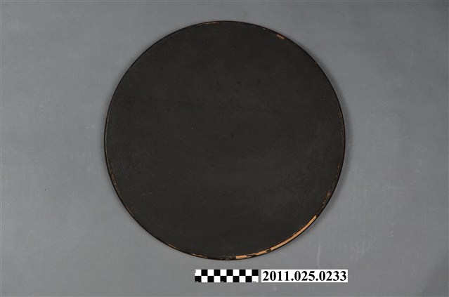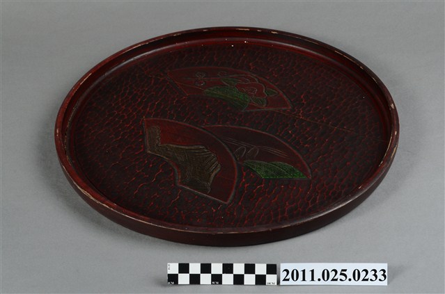 本件以兩片木料底板組成圓形再與木料圓框接合而成。底盤正面將木料以薄肉削剃出許多凹凸層次效果的布景;布景上則呈現出三塊扇形,其中兩塊為交疊狀,扇面上的景物分別有花朵、山巒、林野等,並以黃綠紅等三原色刷塗來營造立體感。盤底背面覆以黑色防滑材料。因年代久遠,正面可看到木板組合處脫漆後的接痕,邊壁周緣處有些微磨損,到然整體保存狀況堪稱良好。