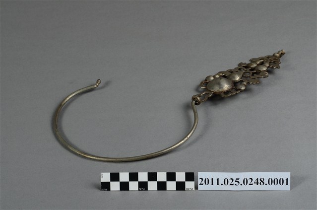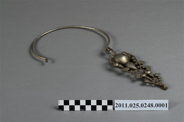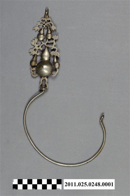 1.本藏品為一對金屬帳鉤中的一個,長15.7公分、寬2.1公分,高32.1公分。帳柄為多個立體葫蘆與扁平的藤蔓組合而成,上端連接繫帶之葫蘆形環已經脫落不見。鉤牙為半弧形,不做裝飾。2.傳統的眠床上都掛有蚊帳布幔,為了方便睡醒後收起,故在兩邊床柱各掛有帳鉤,用以固定蚊帳布幔,稱之為帳鉤。傳統上,製作帳鉤之材質非常豐富,有金屬、玉石、牙骨、木竹、編織物甚至玳瑁殼等皆可使用。帳鉤可分為上端的鉤柄,與下端的鉤牙,鉤柄常被施加各種裝飾,常見有吉祥意味之造型與圖案。