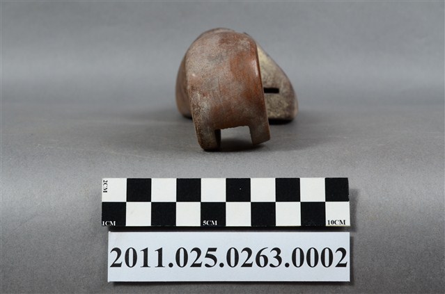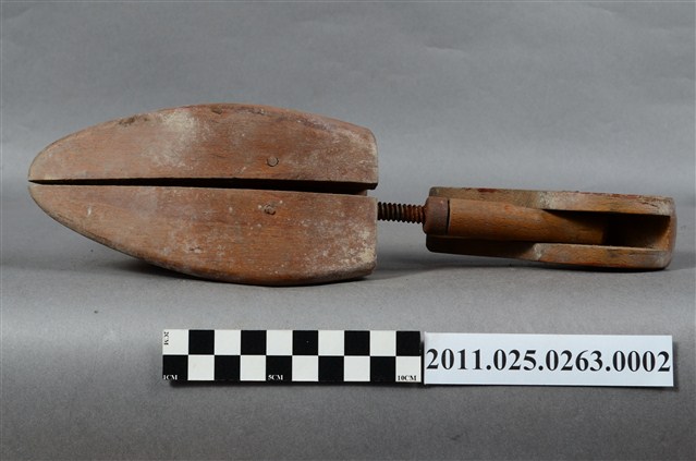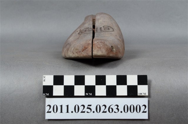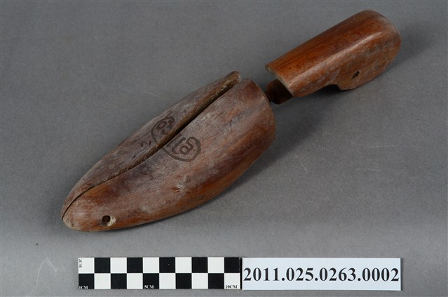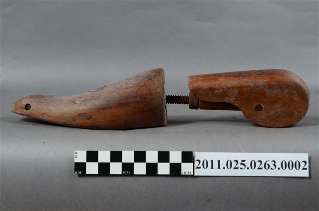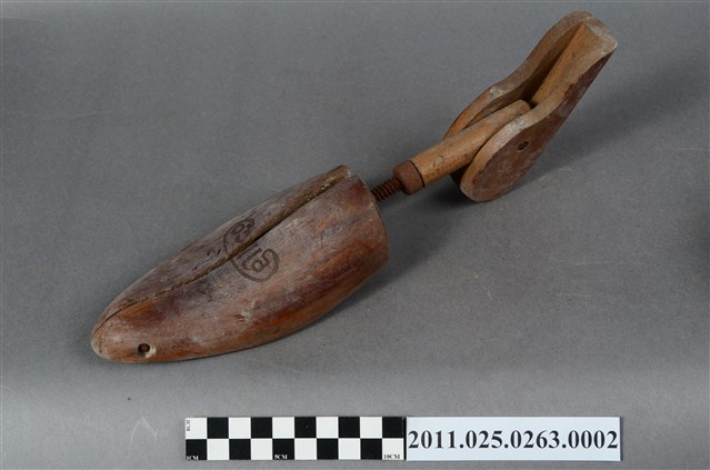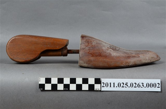 1.本件右腳鞋撐為gilco木製鞋撐組之部件2,呈長7.4公分,寬27.7公分,高5.5公分。主要以木材製作鞋型,透過金屬構件與彈簧組合而成,鞋面印有「gilco」之黑色書寫體商標,以字母g之尾端線條,環繞外圈呈長橢圓形框,商標鞋面部分均帶有白色風化痕跡。前腳掌處分為左右半部,右半部外側弧線較大,左側較小,兩者以金屬彈簧結合,帶有伸縮空間。後腳跟處呈長形扁身木條,尾端作圓扁形,底面削空作凹槽,內部以金屬彈簧連接圓木棒後,利用金屬榫棒與腳跟處作活動式卡榫。2.鞋撐塞入皮鞋時,可先將後腳跟處之木條向上拉起,將前端套入後,再順勢把後腳跟木條下壓即可撐起皮鞋。