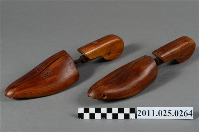 1.木製鞋撐組,共1組2件,分為左腳鞋撐與右腳鞋撐,主要以木材與金屬彈簧組合而成,其外型作左右對稱樣式,鞋面印有「gilco」之黑色書寫體商標,以字母g之尾端線條,環繞外圈呈長橢圓形框。鞋撐之木頭表面帶有打蠟過後的光澤感。2.皮鞋經長期穿著容易使得皮革變軟,或遇雨天淋濕鞋面也容易導致皮革變形,鞋撐為皮鞋日常保養所需之用具,主要功能為塞入皮鞋內,透過木頭與金屬彈簧的支撐力,用來維持鞋型,減少鞋面摺痕產生。另外皮鞋容易發霉,取木材製作的鞋撐具有吸收濕氣,達到防潮效果。