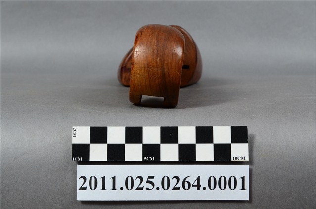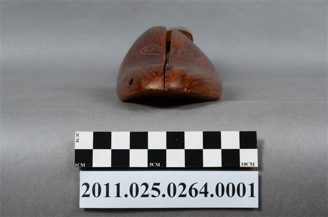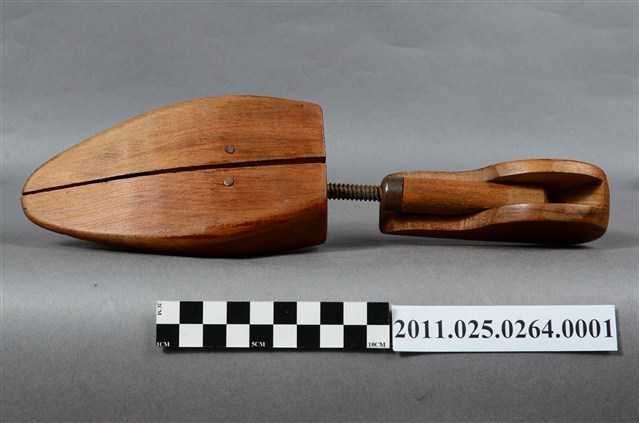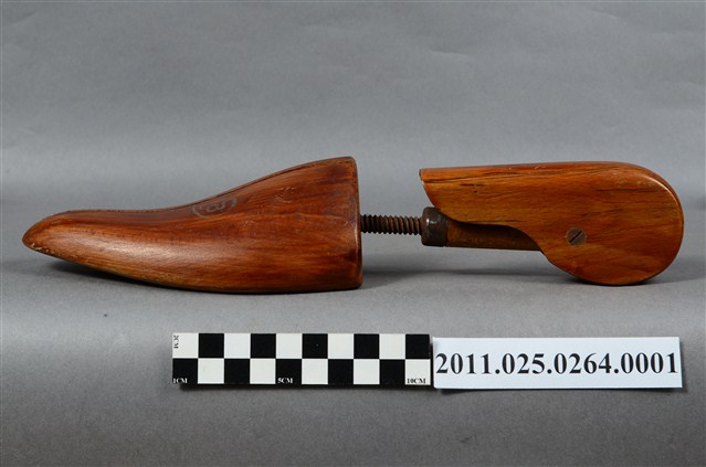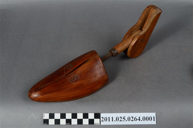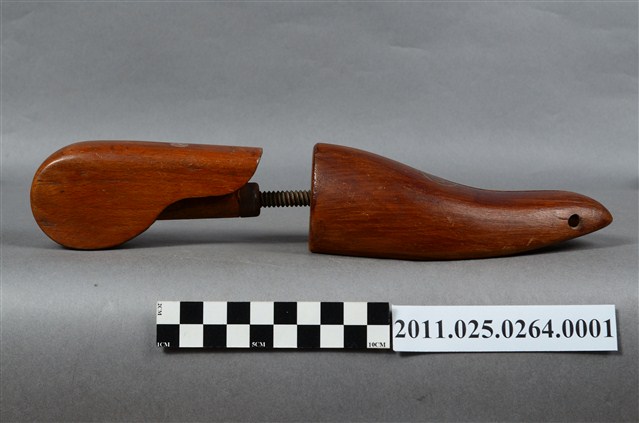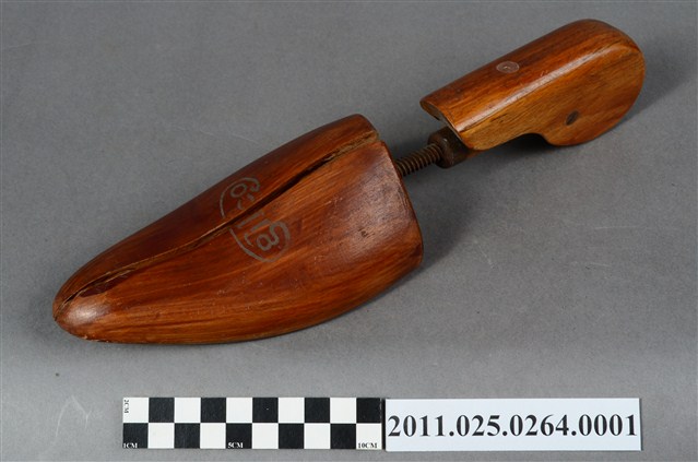 1.本件左腳鞋撐為gilco木製鞋撐組之部件1,呈長7.4公分,寬27.5公分,高5.2公分。主要以木材製作鞋型,透過金屬構件與彈簧組合而成,鞋面印有「gilco」之黑色書寫體商標,以字母g之尾端線條,環繞外圈呈長橢圓形框。前腳掌處分為左右半部,左半部外側弧線較大,右側較小,兩者以金屬彈簧結合,帶有伸縮空間。後腳跟處呈長形扁身木條,尾端作圓扁形,底面削空作凹槽,內部以金屬彈簧連接圓木棒後,利用金屬榫棒與腳跟處作活動式卡榫。2.鞋撐塞入皮鞋時,可先將後腳跟處之木條向上拉起,將前端套入後,再順勢把後腳跟木條下壓即可撐起皮鞋。