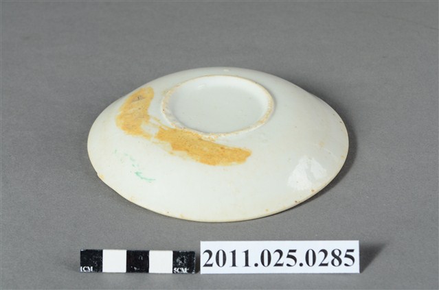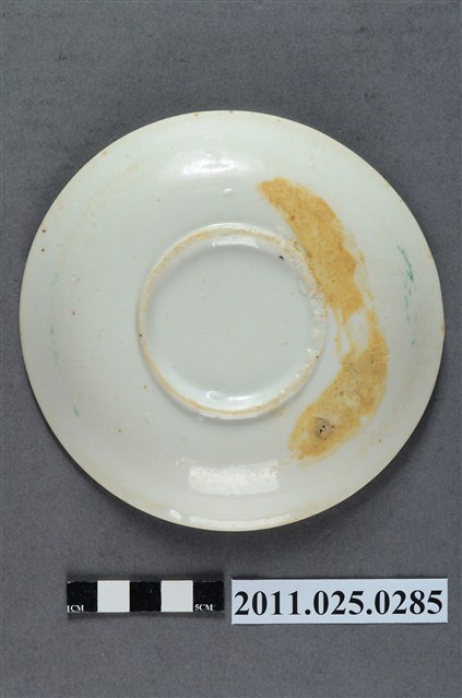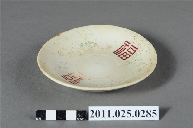 釉上彩轉印福字紋圓盤為高溫燒製、模具成形,圓唇,口沿外侈,斜弧壁下收至圈足,圈足徑略小,小於口徑一半的大小,平底露胎,透出來的胎色略帶黃,胎質細緻。全器滿施白釉,釉面微帶光澤,呈色飽滿,白中帶黃,器表滿佈氣孔,是因高溫燒製導致而成的現象。盤外壁素面無紋,僅盤內有紋樣裝飾。盤心處有一圓形凹槽,凹槽周圍以紅釉轉印「福」字樣。字紋之間搭配兩組彩釉花草紋飾。花草紋飾以彩釉勾勒線條,其中留白並未填彩,使得整件作品顯得更加古樸雅緻。本件作品的圓形凹槽應是配合杯或碗所做的卡榫,是兩件一組的作品中盛放器具的底件。