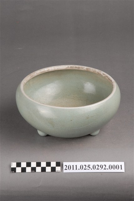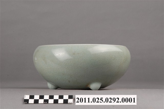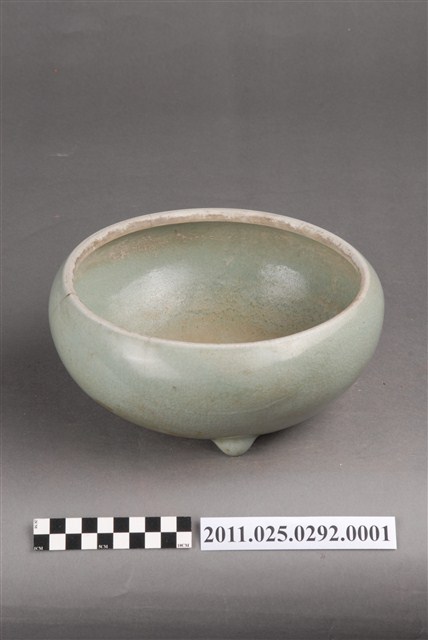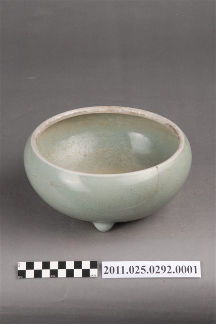 1.本件為青瓷三足香爐,器型特徵為斂口,圓腹,釉色淺青有開片,圓珠式乳形三足,足壁內面有圓形小氣孔,防止燒成時炸裂。此件屬於鄭家家中供奉神明祭祀的香爐,鄭玉記時期即使用至今。2.此批文物捐贈者鄭林月宮女士(1923—)為臺南鄭家人士。所捐贈文物為自鄭玉記(1872-1944)時期即保存自今的家族文物。鄭玉記為清末、日治時期府城大地主之一,曾於1930年代出資修造臺南開元寺彌勒殿以及昭格堂(鄭氏家廟)。鄭林月宮女士丈夫鄭文忠(1919-1993)先生為鄭玉記嫡孫,曾就讀日本早稻田大學政治經濟系。