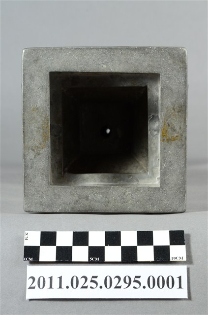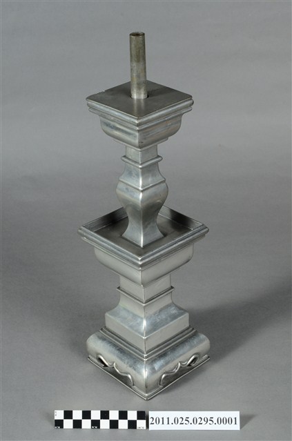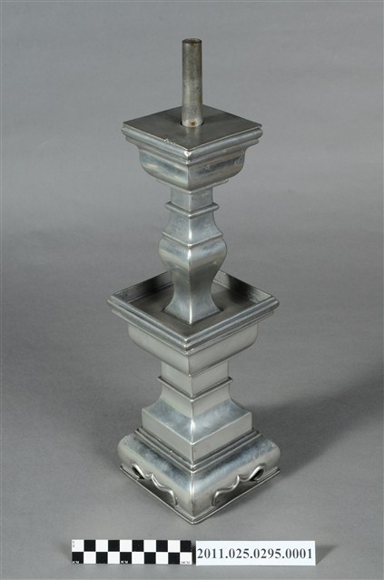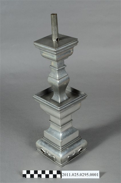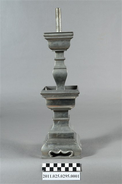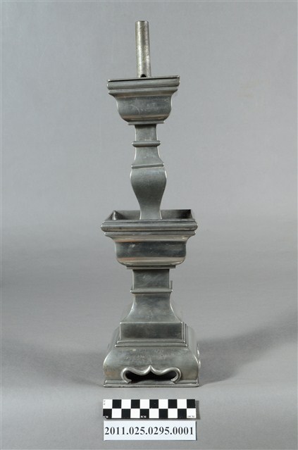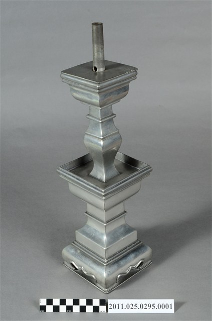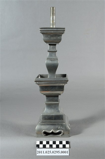 1.本件為錫製燭臺,作方體造形,中間壺身,器身完好微微傾斜,未見紋飾與年款。燭臺是安置蠟燭以祭祀神祇、祖先的禮器。分成祭祀、儀式用具和一般室內用具兩種,前者形體較大,工藝精緻,成對配置,如龍鳳燭臺、壽字燭臺等等,本件屬於祭祀之禮器。燭臺材料多見錫、陶、瓷、銅、木等等。2.此批文物捐贈者鄭林月宮女士(1923—)為臺南鄭家人士。所捐贈文物為自鄭玉記(1872-1944)時期即保存自今的家族文物。鄭玉記為清末、日治時期府城大地主之一,曾於1930年代出資修造臺南開元寺彌勒殿以及昭格堂(鄭氏家廟)。鄭林月宮女士丈夫鄭文忠(1919-1993)先生為鄭玉記嫡孫,曾就讀日本早稻田大學政治經濟系。