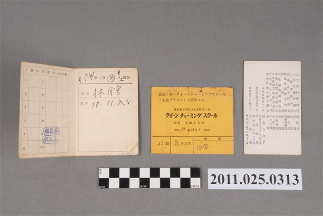 本件為日本山下料理學院學生證,頒發時間為昭和38年(1963)11月27日,編號第1401號。證書上寫有:持有者基本資料。例如「氏名 林月宮 41才」(譯:姓名:林月宮 41歲)、「大正12年12月10日生」、「現住所:品川區大井瀧王子」、「昭和38年11月27日発行」。隨證附有學生證封套1件,名片1件,名片主人為「山下茂」。