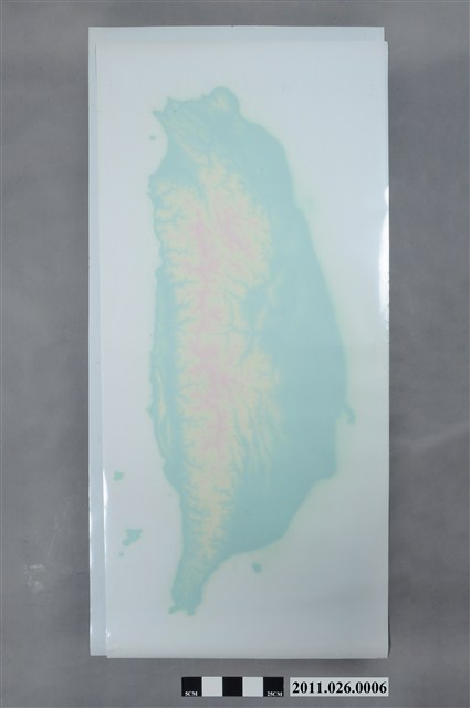 1. 本物件為以臺灣地形圖為主題之地圖膠片,其正面為臺灣地形圖之彩色暈渲圖,中間為以淡綠色描繪臺灣島嶼輪廓之地圖,以不同的顏色象徵地形之海拔高度,可辨識地圖繪製地形包含大屯火山、雪山山脈、大肚台地、八卦台地、中央山脈、阿里山山脈、玉山山脈、花東縱谷及海岸山脈等區域。背面為正面臺灣島型之鏡像圖,以綠色、黃色、橘紅色之漸層表示地勢高低差異,為一幅分層設色圖。2. 此圖總編輯吳信政教授為師大地理系退休教授,在地理學界與地圖學界有極高學術地位。彩色暈渲圖是將「高層分層設色圖」及「地形暈渲圖」套疊而成,具有以不同色彩表示地勢高低變化,以及以暈渲法描繪光線與地面傾斜關係的陰影,展現地形陡緩之立體效果的優點。