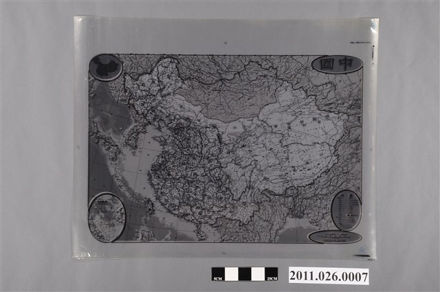 1. 本物件為以中國城市鐵路地圖(黑色色版)為主題之地圖膠片,其正面為黑白色調的中國地圖,地圖繪製有中國國家之版圖範圍、國界、省級行政區界線、省籍名、道路分布等,地圖右上角橢圓形為黑灰色,中間有黑色的中國國家版圖圖樣;右下角直立式橢圓形中繪製有地圖,並標有圖名「南海諸島」;左下角有2個分別為直式及橫式的橢圓形,直式橢圓形為黑灰色底,標有「圖例」,第1排及第4排為圖例符號說明,第2排及第3排為繪製的圖例符號,橫式橢圓形為黑灰色底,內有文字「比例尺:六百萬分之一」、「彭納等面積投影」、「總編輯吳信政」、「製圖吳信恆、邱淑敏」、「1995年5月」、「天涯出版社出版」、「笙暉製版印刷」;左上方有橫式灰色底橢圓形,以黑色字體寫有「中國」。膠板背面為中國城市鐵路地圖之鏡像,右上方灰色底橫式橢圓中有「中國」之鏡像文字;右下方有2個分別為直式及橫式的橢圓形,直式橢圓形為黑灰色底,標有「圖例」之鏡像文字,第1排及第4排為圖例符號說明,第2排及第3排為繪製的圖例符號,橫式橢圓形為黑灰色底,內有「比例尺:六百萬分之一」、「彭納等面積投影」、「總編輯吳信政」、「製圖吳信恆、邱淑敏」、「1995年5月」、「天涯出版社出版」、「笙暉製版印刷」之文字之鏡像文字;左下角直立式橢圓形中繪製有地圖,並標有圖名「南海諸島」之鏡像文字;地圖右上角橢圓形為黑灰色,中間有黑色的中國國家版圖圖樣之鏡像。2. 地圖印刷上採用四色印刷,先將原稿進行色分解,按減色混合原理實現全彩色複製的平版印刷方法,分成青(C)、品紅(M)、黃(Y)、黑(K)四色色版,通常按照黑、藍、紅、黃順序印刷,地圖上各要素用色也有規定。此圖總編輯吳信政教授為師大地理系退休教授,具有地圖學、地圖設計、遙測學等專長,製圖大多採用渲染法,透過渲染繪製而成的地圖,可以讓地形高度更清楚也更容易閱讀。