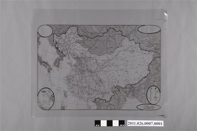 1. 本物件為以中國城市鐵路地圖(黑色色版)之一為主題之地圖膠片,其正面為黑白色調的中國地圖,地圖中以粗細不同的線條劃分中國國家之版圖國界、省級行政區界線道路分布等;地圖右上角白色橢圓形中,繪有中國國家版圖以及省級行政區分界;右下角直立式橢圓形中繪製有地圖,並標有圖名「南海諸島」;左下角有2個分別為直式及橫式的橢圓形,直式橢圓形標有「圖例」,第1排及第4排為圖例符號說明,第2排及第3排為繪製的圖例符號,橫式橢圓形內有文字「比例尺:六百萬分之一」、「彭納等面積投影」、「總編輯吳信政」、「製圖吳信恆、邱淑敏」、「1995年5月」、「天涯出版社出版」、「笙暉製版印刷」;左上方有橫式橢圓形,以白色具有陰影的字體寫有「中國」二字。2. 地圖印刷上採用四色印刷,先將原稿進行色分解,按減色混合原理實現全彩色複製的平版印刷方法,分成青(C)、品紅(M)、黃(Y)、黑(K)四色色版,通常按照黑、藍、紅、黃順序印刷,地圖上各要素用色也有規定。此圖總編輯吳信政教授為師大地理系退休教授,具有地圖學、地圖設計、遙測學等專長,製圖大多採用渲染法,透過渲染繪製而成的地圖,可以讓地形高度更清楚也更容易閱讀。