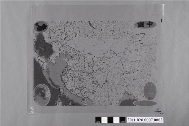 1. 本物件為以中國城市鐵路地圖(青色色版)之二為主題之地圖膠片,其正面為黑白色調的中國地圖,地圖繪製有東亞中國國家之版圖範圍、省級行政區界線、地形紋路之分布等,地圖右上角橢圓形為灰色,中間有黑色的中國國家版圖;右下角直立式橢圓形中繪製有地圖,並標有圖名「南海諸島」;左下角有2個分別為直式及橫式的橢圓形,直式橢圓形為灰色底,以白色字體標有「圖例」,第1排及第4排為圖例符號說明,第2排及第3排為繪製的圖例符號,橫式橢圓形為灰色底,內有文字「比例尺:六百萬分之一」、「彭納等面積投影」、「總編輯吳信政」、「製圖吳信恆、邱淑敏」、「1995年5月」、「天涯出版社出版」、「笙暉製版印刷」;左上方有橫式灰色底橢圓形,以黑色字體寫有「中國」。2. 地圖印刷上採用四色印刷,先將原稿進行色分解,按減色混合原理實現全彩色複製的平版印刷方法,分成青(C)、品紅(M)、黃(Y)、黑(K)四色色版,通常按照黑、藍、紅、黃順序印刷,地圖上各要素用色也有規定。此圖總編輯吳信政教授為師大地理系退休教授,具有地圖學、地圖設計、遙測學等專長,製圖大多採用渲染法,透過渲染繪製而成的地圖,可以讓地形高度更清楚也更容易閱讀。