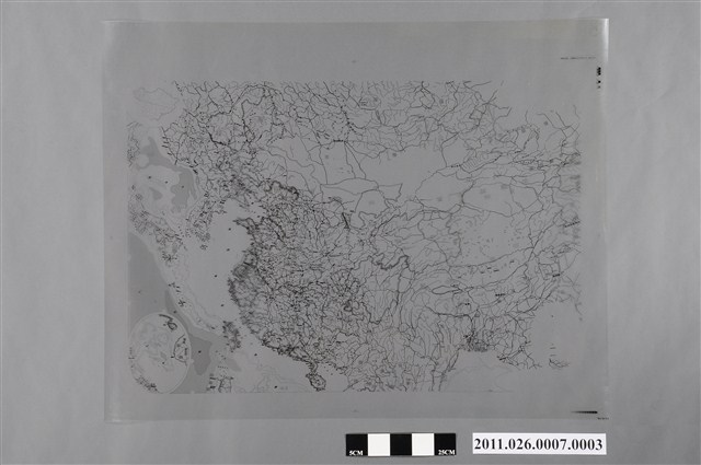 1. 本物件為以中國城市鐵路地圖(洋紅色色版)之三為主題之地圖膠片,其正面為黑白色調的東亞地區,地圖涵蓋範圍有中國、蒙古、日本、南北韓、臺灣、海南島等區域,以粗細不同的線條繪製有省級行政區界線、地形紋路之分布、鐵路之道路路線等;右下角有1直立式橢圓形中繪製有地圖;地圖外之左下角處有1長條的黑色、灰色、白色之漸層色階。2. 地圖印刷上採用四色印刷,先將原稿進行色分解,按減色混合原理實現全彩色複製的平版印刷方法,分成青(C)、品紅(M)、黃(Y)、黑(K)四色色版,通常按照黑、藍、紅、黃順序印刷,地圖上各要素用色也有規定。此圖總編輯吳信政教授為師大地理系退休教授,具有地圖學、地圖設計、遙測學等專長,製圖大多採用渲染法,透過渲染繪製而成的地圖,可以讓地形高度更清楚也更容易閱讀。