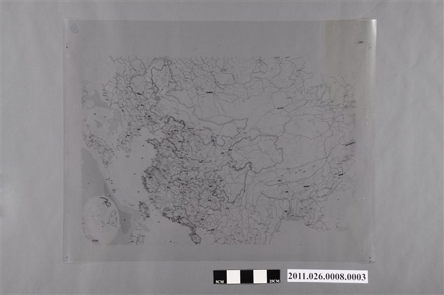 1. 本物件為以中國城市鐵路地圖(K)之三為主題之地圖膠片,其正面為黑白色調的東亞地區,地圖涵蓋範圍有中國、蒙古、日本、南北韓、臺灣、海南島等區域,以粗細不同的線條繪製有省級行政區界線、地形紋路之分布等,並疑似有標註各點及各區之地名;右下角有1直立式橢圓形中繪製有地圖,沒有標示圖名;地圖外之右上角處有1藍筆畫記的圓圈,並疑似寫有阿拉伯數字「1」。2. 地圖印刷上採用四色印刷,先將原稿進行色分解,按減色混合原理實現全彩色複製的平版印刷方法,分成青(C)、品紅(M)、黃(Y)、黑(K)四色色版,通常按照黑、藍、紅、黃順序印刷,地圖上各要素用色也有規定。此圖總編輯吳信政教授為師大地理系退休教授,具有地圖學、地圖設計、遙測學等專長,製圖大多採用渲染法,透過渲染繪製而成的地圖,可以讓地形高度更清楚也更容易閱讀。