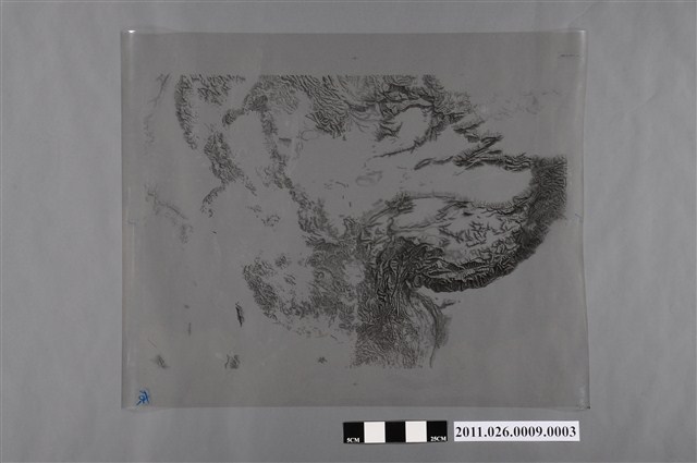 1. 本物件為以中國地形圖之三為主題之地圖膠片,應為以暈渲法繪製的灰黑色調地圖,繪製區域為中國、蒙古、南北韓、日本、臺灣等東亞地區,並以中國為主要繪製區域,可觀察出所呈現中國之地形包含:準噶爾盆地、塔里木盆地、青藏高原、橫斷山脈、雲貴高原等地形,該地圖沒有圖框、圖名以及比例尺等資訊,地圖之右下角處有藍色標記,無法辨識。2. 此圖總編輯吳信政教授為師大地理系退休教授,在地理學界與地圖學界有極高學術地位。「地形暈渲圖」以暈渲法繪製,根據光線與地面傾斜關係描繪陰影,並以深淺不同顏色展現地形陡緩。