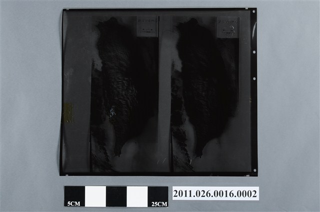 1. 本物件為以臺灣衛星影像之二為主題之膠片,其正面有兩張臺灣衛星影像圖,右方長方形圖框中為黑白色調的臺灣衛星影像圖,中間可辨識為臺灣島嶼之輪廓,及島嶼地形圖,顏色較淡部分為雪山山脈、中央山脈、阿里山山脈、玉山山脈之區域,顏色較深部分為平原地區,左上方框中標有文字由上至下可能為「臺灣衛星影像」、「國立中央大學」、「太空及遙測研究中心」;左方長方形圖框中為黑白色調的臺灣衛星影像圖,中間為臺灣島嶼之輪廓及地形呈現,中間南北向山脈部分為深灰色區域,平原地區則為黑色區域,並可觀察北部有1條白線為淡水河,中部白線分別為大肚溪、濁水溪,左上方框中標有文字由上至下可能為「臺灣衛星影像」、「國立中央大學」、「太空及遙測研究中心」。2. 此圖總編輯吳信政教授為師大地理系退休教授,具有地圖學、地圖設計、遙測學等專長,製圖大多採用渲染法,透過渲染繪製而成的地圖,可以讓地形高度更清楚也更容易閱讀。國立中央大學太空及遙測中心於西元1984年7月1日成立,以太空及遙測科學的研究與教學,和遙測技術發展應用為主要任務,並設置有遙測技術、空間資訊、太空科學三個研究群。