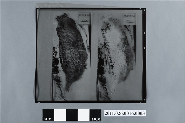 1. 本物件為以臺灣衛星影像之三為主題之膠片,其正面有兩張臺灣衛星影像圖,右方長方形圖框中為黑白色調的臺灣衛星影像圖,中間可辨識為臺灣島嶼之輪廓,並以灰白色階呈現島嶼地形地貌,包含南北向山脈區域,及西部平原地帶,可明顯觀察北部有1V字型白線為淡水河,中部有烏溪及濁水溪,南部有高屏溪,左上方灰色框中標有文字由上至下可能為「臺灣衛星影像」、「國立中央大學」、「太空及遙測研究中心」;左方長方形圖框中為黑白色調的臺灣衛星影像圖,中間為臺灣島嶼之輪廓,中間南北向山脈部分為灰白色區域,平原地區則呈現灰色,並可觀察由北至南有大安溪、大甲溪、大肚溪、濁水溪、高屏溪,左上方灰色框中標有文字由上至下可能為「臺灣衛星影像」、「國立中央大學」、「太空及遙測研究中心」。2. 此圖總編輯吳信政教授為師大地理系退休教授,具有地圖學、地圖設計、遙測學等專長,製圖大多採用渲染法,透過渲染繪製而成的地圖,可以讓地形高度更清楚也更容易閱讀。國立中央大學太空及遙測中心於西元1984年7月1日成立,以太空及遙測科學的研究與教學,和遙測技術發展應用為主要任務,並設置有遙測技術、空間資訊、太空科學三個研究群。