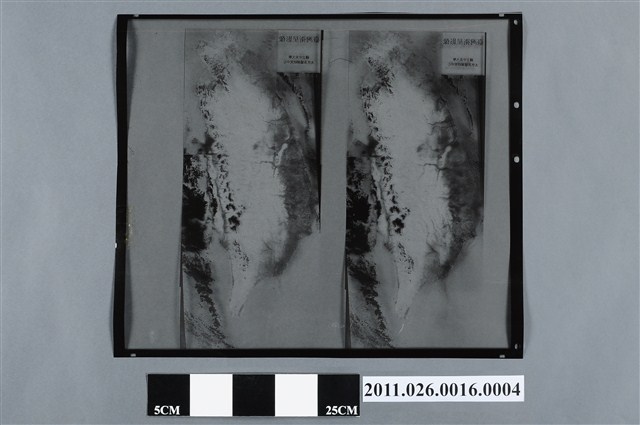 1. 本物件為以臺灣衛星影像之四為主題之膠片,其正面有兩張臺灣衛星影像圖,右方長方形圖框中為黑白色調的臺灣衛星影像圖,中央為臺灣島嶼之輪廓,並以灰白色階呈現島嶼輪廓之地形地貌,南北向山脈區域為白色,西部平原地帶為灰色,可觀察由北至南之水文線為頭前溪、後龍溪、大安溪、大甲溪、大肚溪、濁水溪、朴子溪、高屏溪,左上方灰色框中標有文字由上至下可能為「臺灣衛星影像」、「國立中央大學」、「太空及遙測研究中心」;左方長方形圖框中為黑白色調的臺灣衛星影像圖,中間為臺灣島嶼之輪廓,中間南北向山脈部分為白色區域,平原地區則呈現灰色,並可觀察由北至南有頭前溪、後龍溪、大安溪、大甲溪、大肚溪、濁水溪、朴子溪、高屏溪,左上方灰色框中標有文字由上至下可能為「臺灣衛星影像」、「國立中央大學」、「太空及遙測研究中心」。2. 此圖總編輯吳信政教授為師大地理系退休教授,具有地圖學、地圖設計、遙測學等專長,製圖大多採用渲染法,透過渲染繪製而成的地圖,可以讓地形高度更清楚也更容易閱讀。國立中央大學太空及遙測中心於西元1984年7月1日成立,以太空及遙測科學的研究與教學,和遙測技術發展應用為主要任務,並設置有遙測技術、空間資訊、太空科學三個研究群。
