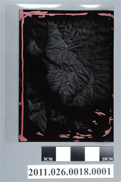 1. 本物件為以地形圖(局部)之一為主題之膠片,其正面為以黑灰色色調繪製之地形,中間可觀察有以暈渲法繪製之地貌,無法辨識該地形所在位置及區域。2.此圖總編輯吳信政教授為師大地理系退休教授,具有地圖學、地圖設計、遙測學等專長;本地圖為「地形暈渲圖」以暈渲法繪製,根據光線與地面傾斜關係描繪陰影,並以深淺不同顏色展現地形陡緩。