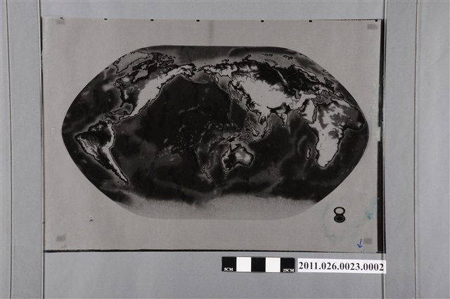 1. 本物件為以世界地形圖之二為主題之膠片,其正面為黑白色調的世界地圖膠片,中間為橢圓形的橫麥卡托世界地圖,由右至左為北美洲、南美洲、澳洲、歐亞大陸、非洲之陸塊,白色的部分,應為較高之地形部分,由右至左為北美洲洛磯山脈、南美洲巴西高原、安地斯山脈、澳洲大分水嶺、歐亞大陸青藏高原、德干高原、阿拉伯半島、歐洲喀爾巴阡山、阿爾卑斯山、庇里牛斯山、斯堪地那維亞山脈、非洲衣索比亞高原、東非高原、南非高原、安哥拉高原,海洋部分為由右至左為大西洋、太平洋、印度洋、大西洋,地圖底側為南極大陸;地圖左下角有1個由2個橢圓形組合的8字形圖樣,旁邊有1個藍色的「↓」符號。2.此圖總編輯吳信政教授為師大地理系退休教授,具有地圖學、地圖設計、遙測學等專長;橫麥卡托投影法由佛蘭德的地圖學家Gerardus Mercator發明,為圓筒投影,將圓筒相切於赤道位置進行正形投影,具有緯線在地圖上為直線,便於航海之優點,但對於高緯度地區則會因正形投影而間格變大,地區變形的缺點。