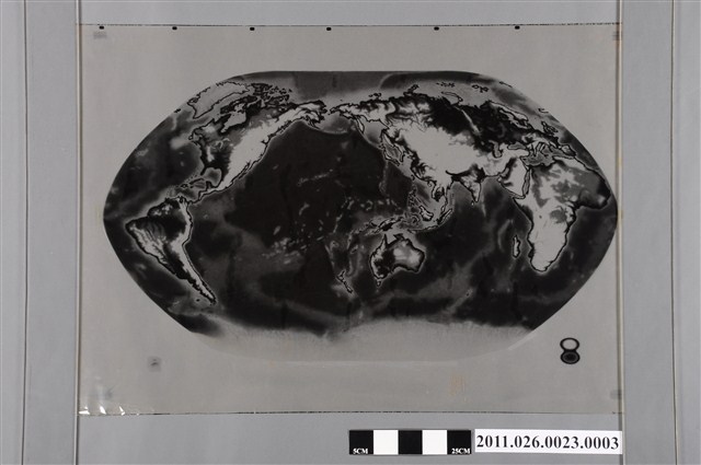 1. 本物件為以世界地形圖之三為主題之膠片,其正面為黑白色調的世界地圖膠片,中間為橢圓形的橫麥卡托世界地圖,由右至左為北美洲、南美洲、澳洲、歐亞大陸、非洲之陸塊,白色的部分,應為較高之地形部分,由右至左為北美洲洛磯山脈、南美洲巴西高原、安地斯山脈、澳洲大分水嶺、歐亞大陸青藏高原、德干高原、阿拉伯半島、歐洲喀爾巴阡山、阿爾卑斯山、庇里牛斯山、斯堪地那維亞山脈、非洲衣索比亞高原、東非高原、南非高原、安哥拉高原,海洋部分為由右至左為大西洋、太平洋、印度洋、大西洋,地圖底側為南極大陸;地圖左下角有1個由2個橢圓形組合的8字形圖樣。2.此圖總編輯吳信政教授為師大地理系退休教授,具有地圖學、地圖設計、遙測學等專長;橫麥卡托投影法由佛蘭德的地圖學家Gerardus Mercator發明,為圓筒投影,將圓筒相切於赤道位置進行正形投影,具有緯線在地圖上為直線,便於航海之優點,但對於高緯度地區則會因正形投影而間格變大,地區變形的缺點。