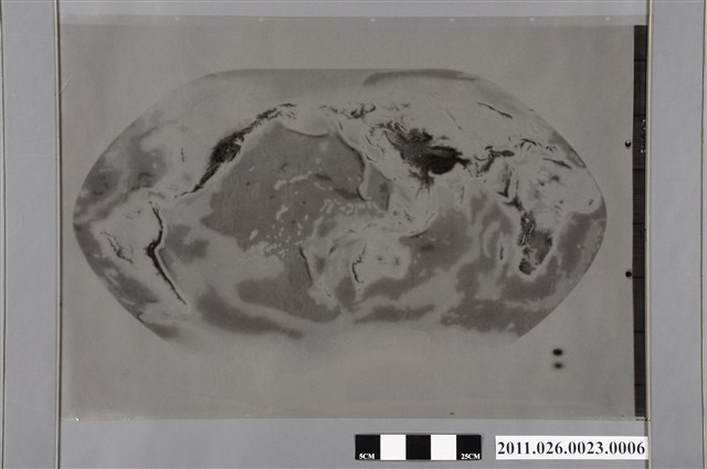 1. 本物件為以世界地形圖之六為主題之膠片,其正面為黑白色調的世界地圖膠片,中間為橢圓形的橫麥卡托世界地圖,顏色較淡的白色區域由右至左應為北美洲、南美洲、澳洲、歐亞大陸、非洲之陸塊,顏色較深的黑色的部分,由右至左應為北美洲洛磯山脈、南美洲巴西高原、安地斯山脈、澳洲大分水嶺、歐亞大陸青藏高原、德干高原、阿拉伯半島、歐洲喀爾巴阡山、阿爾卑斯山、庇里牛斯山、斯堪地那維亞山脈、非洲衣索比亞高原、東非高原、南非高原、安哥拉高原,色調灰色部分為海洋由右至左為大西洋、太平洋、印度洋、大西洋,地圖底側為南極大陸;地圖左下角有1個有2個橢圓形,上方為中心黑色漸層至灰色橢圓,下方為由中心黑色漸層至灰色橢圓。2. 此圖總編輯吳信政教授為師大地理系退休教授,具有地圖學、地圖設計、遙測學等專長;橫麥卡托投影法由佛蘭德的地圖學家Gerardus Mercator發明,為圓筒投影,將圓筒相切於赤道位置進行正形投影,具有緯線在地圖上為直線,便於航海之優點,但對於高緯度地區則會因正形投影而間格變大,地區變形的缺點。