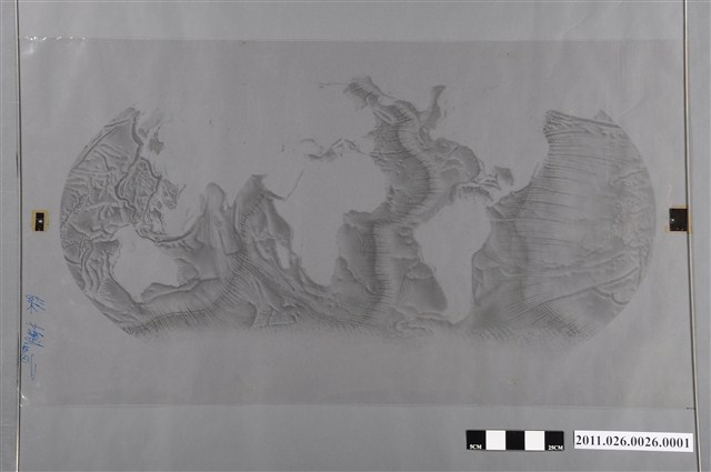1. 本物件為以世界地圖之一為主題之膠片,其正面為黑白色調世界地圖,以橫麥卡托投影法繪製,地圖沒有標示圖名、比例尺,沒有繪製經緯線,由右至左以白色繪製有澳洲、大洋洲、歐亞大陸、非洲、北美洲、中南美洲、南美洲、南極洲之陸塊輪廓,並以灰階色調繪製太平洋、印度洋、大西洋之海底地形,右下角處以藍色字體標註有「深藍」,並標有1個「↓」符號。2. 此圖總編輯吳信政教授為師大地理系退休教授,具有地圖學、地圖設計、遙測學等專長;橫麥卡托投影法由佛蘭德的地圖學家Gerardus Mercator發明,為圓筒投影,將圓筒相切於赤道位置進行正形投影,具有緯線在地圖上為直線,便於航海之優點,但對於高緯度地區則會因正形投影而間格變大,地區變形的缺點。
