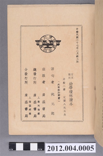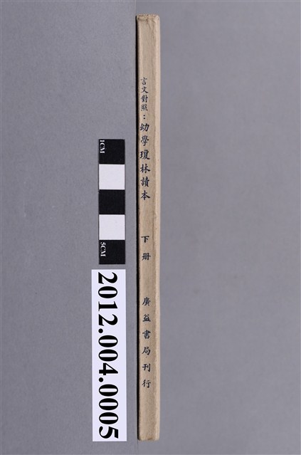 為兒童啟蒙讀物,內容包含人倫關係、天文地理、食衣住行等面向,原書成於明代,後經多次增補。本件為文言文與白話文對照版本,並有標點符號,係廣益書局刊行。