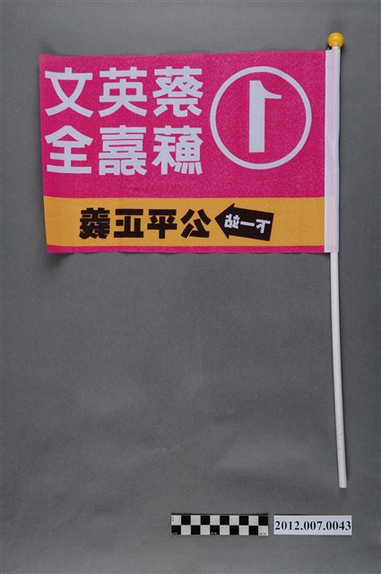 此為一旗幟,以紅色為底,以白色字體印有「➀蔡英文 蘇嘉全」,下方以黃色為底印有以黑色箭頭為底的「下一站」並以黑色字體印有「公平正義」。 此物件為2012年的第13任總統副總統選舉民主進步黨候選人的相關競選物件,此次選舉由代表中國國民黨的馬英九、吳敦義;代表民主進步黨的蔡英文、蘇嘉全;代表親民黨的宋楚瑜、林瑞雄參與選舉。代表民進黨的蔡英文與同為民進黨籍的蘇貞昌經過黨內競爭後脫穎而出,並且在選舉中以「經濟」、「農業」、「兩岸」等議題以爭取選票,並以「TAIWAN NEXT」、「臺灣第一女總統」為競選口號。最終,代表國民黨的馬英九、吳敦義組合當選,馬英九成功連任第13任總統。