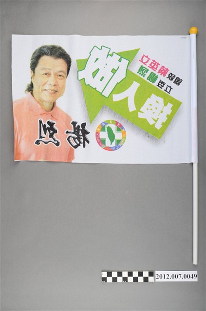 此為一旗幟,以白色為底,右方印有楊烈的照片,是中華民國第8屆立法委員選舉,台北市第一選區(北投區、士林區13里)民主進步黨立法委員候選人楊烈的競選文宣。 本物件的主要人物為楊烈,臺南市新營區人,為臺灣的歌手、演員及政治家。曾發行過《如果能夠》、《飛揚的歌手》專輯,並參與多齣電視劇的演出。楊烈於2011年被民主進步黨徵召參選臺北市第1選區立法委員,並在本物件提及的2012年立法委員選舉中對上代表中國國民黨參選的丁守中,最終落選。 臺灣的立法委員選舉始於1948年,尚領有部分中國領土的中華民國政府以全國各省、直轄市,以及邊疆民族、僑民、職業團體為範疇舉行選舉。1949年中央政府遷臺,自中國大陸各省隨附來臺的立法委員,依「司法院大法官會議釋字第31號解釋」得以國家發展、社會安定之需要而無限期延任。1969年,中華民國政府發佈《動員戡亂時期自由地區中央公職人員增選補選辦法》展開立法委員的增補選,此後每屆選舉之競爭益加激烈,甚至於1977年爆發「中壢事件」。最後,經歷1991年的憲法增修,政府得以正式展開「中央民意代表全面改選」,並於1992年舉辦了第二屆立法委員選舉。