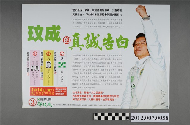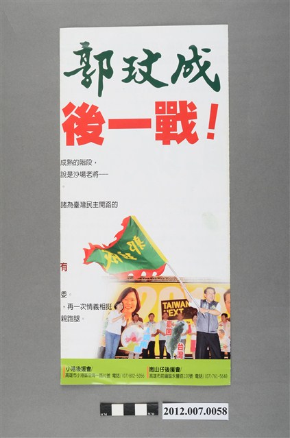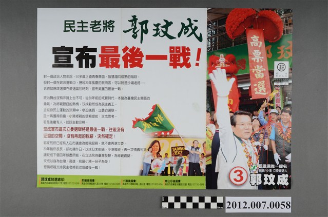 此為一紙質印刷品,為彩色印刷,雙面印刷,二折後使用,正面右方為郭玟成參與競選活動的照片,此為中華民國第8屆立法委員選舉,高雄市第九選區(小港區、前鎮區51里)民主進步黨立法委員候選人郭玟成的競選文宣。 本物件的主要人物為郭玟成,嘉義人。曾擔任合併前的高雄市議會第3至5屆市議員,在第5屆任期中轉任立法委員,並持續擔任第5至7屆立法委員,後在本物件提及的2012年立法委員選舉中,因民主進步黨的陳致中執意脫黨參選,而被分散票源以致於敗給代表中國國民黨的林國正,對此郭玟成表示「國民黨打我卅年,不如扁家打我一年」。 臺灣的立法委員選舉始於1948年,尚領有部分中國領土的中華民國政府以全國各省、直轄市,以及邊疆民族、僑民、職業團體為範疇舉行選舉。1949年中央政府遷臺,自中國大陸各省隨附來臺的立法委員,依「司法院大法官會議釋字第31號解釋」得以國家發展、社會安定之需要而無限期延任。1969年,中華民國政府發佈《動員戡亂時期自由地區中央公職人員增選補選辦法》展開立法委員的增補選,此後每屆選舉之競爭益加激烈,甚至於1977年爆發「中壢事件」。最後,經歷1991年的憲法增修,政府得以正式展開「中央民意代表全面改選」,並於1992年舉辦了第二屆立法委員選舉。