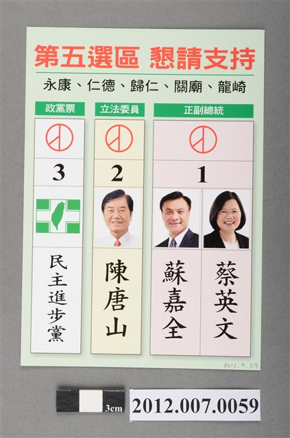 此為一紙質印刷品,為彩色印刷,雙面印刷,左右分別為蔡英文、陳唐山的照片,為中華民國第8屆立法委員選舉,臺南市第五選區(永康區、仁德區、歸仁區、關廟區、龍崎區)民主進步黨籍立法委員候選人陳唐山的競選文宣。 本物件的主要人物為陳唐山,臺南市鹽水區人,為政治人物以及氣象學家。曾擔任外交部長、國安會秘書長、總統府秘書長、臺南縣長。後擔任第2、5、8屆立法委員,在該物件代表的2012年的第8屆立法委員中,於臺南市第5選區中擊敗中國國民黨派出的李全教。另外陳唐山曾任美國國家海洋暨大氣總署研究員,投入研發環境觀測衛星中,並偵測南極的臭氧層空洞。 臺灣的立法委員選舉始於1948年,尚領有部分中國領土的中華民國政府以全國各省、直轄市,以及邊疆民族、僑民、職業團體為範疇舉行選舉。1949年中央政府遷臺,自中國大陸各省隨附來臺的立法委員,依「司法院大法官會議釋字第31號解釋」得以國家發展、社會安定之需要而無限期延任。1969年,中華民國政府發佈《動員戡亂時期自由地區中央公職人員增選補選辦法》展開立法委員的增補選,此後每屆選舉之競爭益加激烈,甚至於1977年爆發「中壢事件」。最後,經歷1991年的憲法增修,政府得以正式展開「中央民意代表全面改選」,並於1992年舉辦了第二屆立法委員選舉。