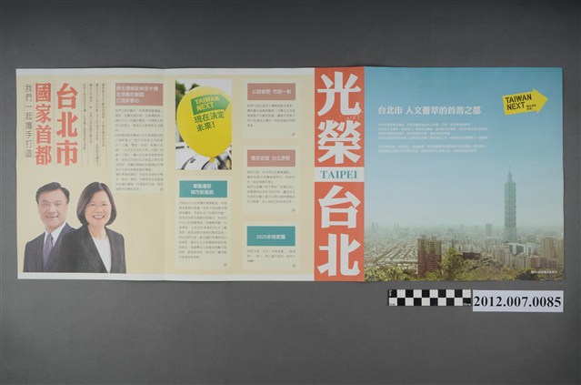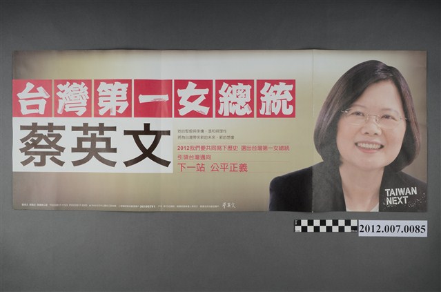 此物件為雙面印刷,二折後使用,是中華民國第13任民主進步黨正副總統候選人蔡英文與蘇嘉全的競選文宣。