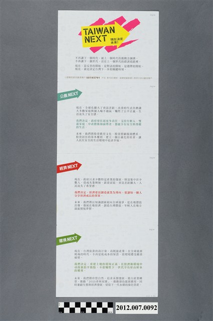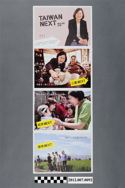 此物件為雙面印刷,三折後使用,是中華民國第13任民主進步黨正副總統候選人蔡英文與蘇嘉全的競選文宣。
