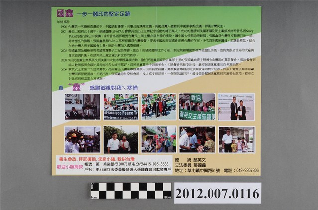 此為一紙質印刷品,為彩色印刷,雙面印刷,此為中華民國第8屆立法委員選舉,南投縣第一選區(草屯鎮、國姓鄉、埔里鎮、仁愛鄉、中寮鄉、魚池鄉)民主進步黨立法委員候選人張國鑫的競選文宣。 此物件提到的張國鑫,為民主進步黨籍的政治人物,為南投縣草屯鎮人,畢業於美國德州農工大學電機博士,曾擔任民進黨美國矽谷支黨部主委、美國菲思卡爾半導體公司高級系統架構師。在本物件提及的2012年第8屆立法委員選舉中,民進黨徵召張國鑫參選南投縣第1選區的區域立委,最終敗給代表中國國民黨的馬文君,而在2016年立委選舉中,再次落選。 臺灣的立法委員選舉始於1948年,尚領有部分中國領土的中華民國政府以全國各省、直轄市,以及邊疆民族、僑民、職業團體為範疇舉行選舉。1949年中央政府遷臺,自中國大陸各省隨附來臺的立法委員,依「司法院大法官會議釋字第31號解釋」得以國家發展、社會安定之需要而無限期延任。1969年,中華民國政府發佈《動員戡亂時期自由地區中央公職人員增選補選辦法》展開立法委員的增補選,此後每屆選舉之競爭益加激烈,甚至於1977年爆發「中壢事件」。最後,經歷1991年的憲法增修,政府得以正式展開「中央民意代表全面改選」,並於1992年舉辦了第二屆立法委員選舉。
