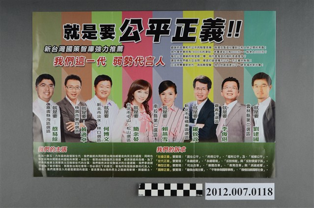 此為一紙質印刷品,為彩色印刷,雙面印刷,二折後使用,此為中華民國第8屆立法委員選舉,台北市第三選區(中山區、松山區20里)民主進步黨立法委員候選人簡余晏的競選文宣。 此物件提到的簡余燕,為民主進步黨籍的政治人物,為南投縣人,畢業於政治大學新聞系並具備傳播背景。在本物件提及的2012年第8屆立法委員選舉中,民進黨派出簡余燕參選臺北市第1選區的區域立委,最終敗給代表中國國民黨的羅淑蕾,另也曾擔任臺北市議會第10、11屆市議員,並於2014年進入臺北市政府擔任觀光傳播局局長。 臺灣的立法委員選舉始於1948年,尚領有部分中國領土的中華民國政府以全國各省、直轄市,以及邊疆民族、僑民、職業團體為範疇舉行選舉。1949年中央政府遷臺,自中國大陸各省隨附來臺的立法委員,依「司法院大法官會議釋字第31號解釋」得以國家發展、社會安定之需要而無限期延任。1969年,中華民國政府發佈《動員戡亂時期自由地區中央公職人員增選補選辦法》展開立法委員的增補選,此後每屆選舉之競爭益加激烈,甚至於1977年爆發「中壢事件」。最後,經歷1991年的憲法增修,政府得以正式展開「中央民意代表全面改選」,並於1992年舉辦了第二屆立法委員選舉。