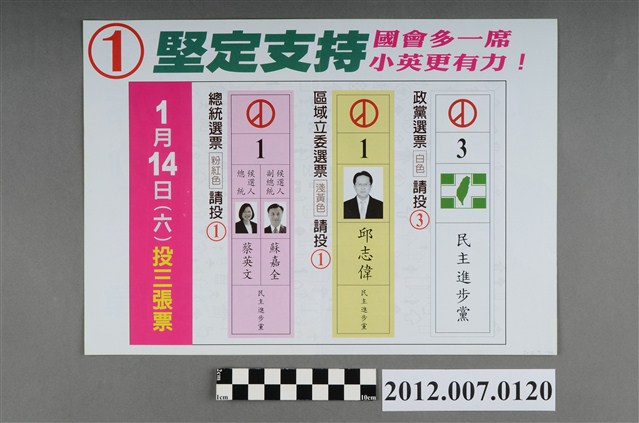 此為一紙質印刷品,為彩色印刷,雙面印刷,左方為邱志偉、蔡英文的照片,此為中華民國第8屆立法委員選舉,高雄市第二選區(茄萣區、湖內區、路竹區、永安區、岡山區、彌陀區、梓官區、橋頭區)民主進步黨立法委員候選人邱志偉的競選文宣。 此物件提到的邱志偉,為民主進步黨籍的政治人物,為屏東縣麟洛鄉人,曾擔任高雄縣民政處長、高雄市民政局長。後在本物件提及的2012年第8屆立法委員選舉中,民進黨派出邱志偉參選高雄市第2選區的區域立委,最終擊敗代表中國國民黨的林益世,後曾連任第9、10屆立法委員。 臺灣的立法委員選舉始於1948年,尚領有部分中國領土的中華民國政府以全國各省、直轄市,以及邊疆民族、僑民、職業團體為範疇舉行選舉。1949年中央政府遷臺,自中國大陸各省隨附來臺的立法委員,依「司法院大法官會議釋字第31號解釋」得以國家發展、社會安定之需要而無限期延任。1969年,中華民國政府發佈《動員戡亂時期自由地區中央公職人員增選補選辦法》展開立法委員的增補選,此後每屆選舉之競爭益加激烈,甚至於1977年爆發「中壢事件」。最後,經歷1991年的憲法增修,政府得以正式展開「中央民意代表全面改選」,並於1992年舉辦了第二屆立法委員選舉。