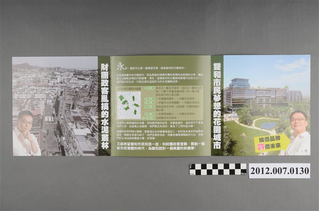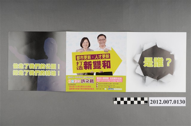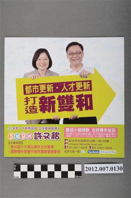 此為一紙質印刷品,為彩色印刷,雙面印刷,二折後使用,左右分別為蔡英文、許又銘的照片,此物件為中華民國第8屆立法委員選舉,新北市第九選區(永和區、中和區17里)民主進步黨立法委員候選人許又銘的競選文宣。 本物件的主要人物為許又銘,新北市永和區人。許又銘於2011年接受民主進步黨徵召,並於本物件相關的2012年第8屆立法委員選舉中,對上代表中國國民黨的立委林福德以及前立委雷倩,最終落選。後擔任桃園航空城股份有限公司的總經理。 臺灣的立法委員選舉始於1948年,尚領有部分中國領土的中華民國政府以全國各省、直轄市,以及邊疆民族、僑民、職業團體為範疇舉行選舉。1949年中央政府遷臺,自中國大陸各省隨附來臺的立法委員,依「司法院大法官會議釋字第31號解釋」得以國家發展、社會安定之需要而無限期延任。1969年,中華民國政府發佈《動員戡亂時期自由地區中央公職人員增選補選辦法》展開立法委員的增補選,此後每屆選舉之競爭益加激烈,甚至於1977年爆發「中壢事件」。最後,經歷1991年的憲法增修,政府得以正式展開「中央民意代表全面改選」,並於1992年舉辦了第二屆立法委員選舉。