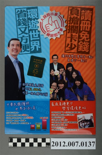此為一塑膠製資料夾,為彩色印刷,其中一面分為左右兩邊,上方印有「人民的小事 總統的大事」的圖章字樣,右方文宣標題為〈擱生一個,政府來照顧〉、左方文宣標題為〈照顧囝仔,政府當保母〉,並各自刊有候選人馬英九的照片。另一面也分左右兩邊,右方文宣標題為〈讀冊免錢,負擔擱卡少〉、左方文宣標題為〈環遊世界省錢又方便〉,並各自也刊有總統候選人馬英九的照片。 此物件為2012年第13任總統副總統選舉時中國國民黨候選人的相關宣傳品,此次選舉由代表中國國民黨的馬英九、吳敦義;代表民主進步黨的蔡英文、蘇嘉全;代表親民黨的宋楚瑜、林瑞雄參與選舉。代表國民黨的馬英九在競選中開設「臺灣加油讚」競選辦公室,並且以「不統不獨」的「兩岸」政策爭取選民選票。最終,代表國民黨的馬英九、吳敦義組合當選,馬英九成功連任第13任總統。