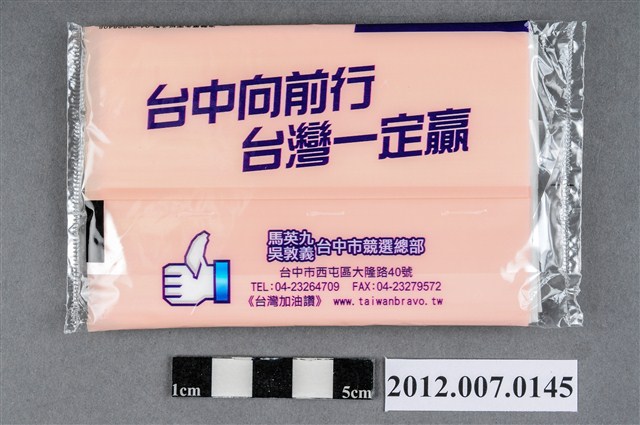 此為一包面紙,外包裝為彩色印刷,以粉色為底,正面左上角印有中國國民黨黨徽,中間為馬英九、吳敦義照片,下方印有「臺中加油」,反面上方印有「臺中向前行,臺灣一定贏」,下方為馬英九、吳敦義臺中市競選總部資訊。 此物件為2012年第13任總統副總統選舉時中國國民黨候選人的相關宣傳品,此次選舉由代表中國國民黨的馬英九、吳敦義;代表民主進步黨的蔡英文、蘇嘉全;代表親民黨的宋楚瑜、林瑞雄參與選舉。代表國民黨的馬英九在競選中開設「臺灣加油讚」競選辦公室,並且以「不統不獨」的「兩岸」政策爭取選民選票。最終,代表國民黨的馬英九、吳敦義組合當選,馬英九成功連任第13任總統。