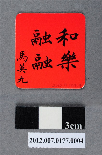 此為一紙質福卡,此福卡共12款,以紅色為底,正面印有國旗及「和」字,後面為「和樂融融」,並由中國國民黨第13任總統候選人馬英九署名。
