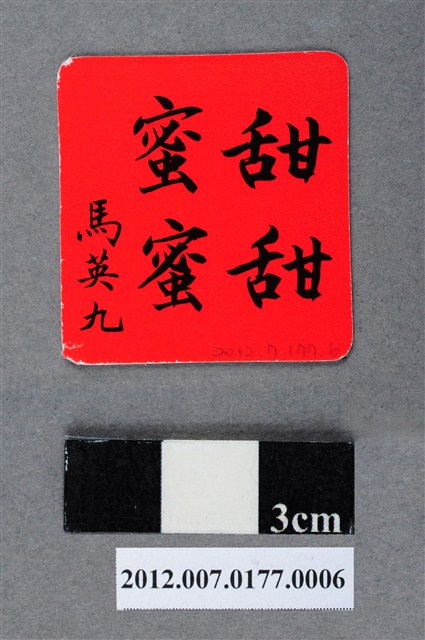 此為一紙質福卡,此福卡共12款,以紅色為底,正面印有國旗及「甜」字,後面為「甜甜蜜蜜」,並由中國國民黨第13任總統候選人馬英九署名。 此物件為2012年第13任總統副總統選舉時中國國民黨候選人的相關宣傳品,此次選舉由代表中國國民黨的馬英九、吳敦義;代表民主進步黨的蔡英文、蘇嘉全;代表親民黨的宋楚瑜、林瑞雄參與選舉。代表國民黨的馬英九在競選中開設「臺灣加油讚」競選辦公室,並且以「不統不獨」的「兩岸」政策爭取選民選票。最終,代表國民黨的馬英九、吳敦義組合當選,馬英九成功連任第13任總統。