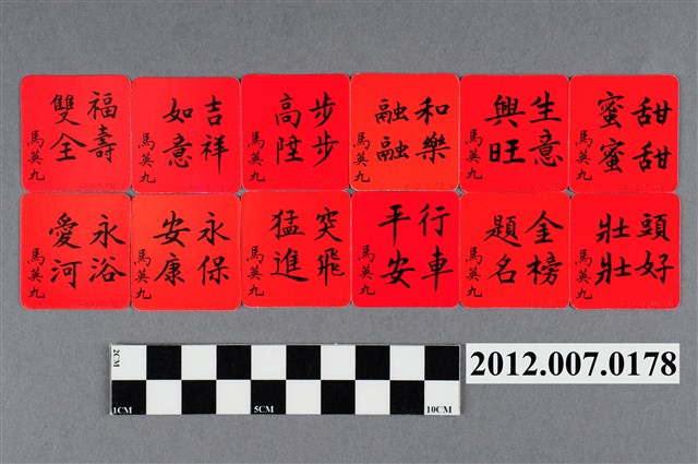 此為一紙質福卡,此福卡共12款,以紅色為底,每一款正面印有國旗及寫一吉祥字,後面為相對應的四字吉祥語,並由中國國民黨第13任總統候選人馬英九署名。 此物件為2012年第13任總統副總統選舉時中國國民黨候選人的相關宣傳品,此次選舉由代表中國國民黨的馬英九、吳敦義;代表民主進步黨的蔡英文、蘇嘉全;代表親民黨的宋楚瑜、林瑞雄參與選舉。代表國民黨的馬英九在競選中開設「臺灣加油讚」競選辦公室,並且以「不統不獨」的「兩岸」政策爭取選民選票。最終,代表國民黨的馬英九、吳敦義組合當選,馬英九成功連任第13任總統。