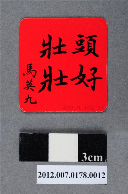 此為一紙質福卡,此福卡共12款,以紅色為底,正面印有國旗及「好」字,後面為「頭好壯壯」,並由中國國民黨第13任總統候選人馬英九署名。 此物件為2012年第13任總統副總統選舉時中國國民黨候選人的相關宣傳品,此次選舉由代表中國國民黨的馬英九、吳敦義;代表民主進步黨的蔡英文、蘇嘉全;代表親民黨的宋楚瑜、林瑞雄參與選舉。代表國民黨的馬英九在競選中開設「臺灣加油讚」競選辦公室,並且以「不統不獨」的「兩岸」政策爭取選民選票。最終,代表國民黨的馬英九、吳敦義組合當選,馬英九成功連任第13任總統。