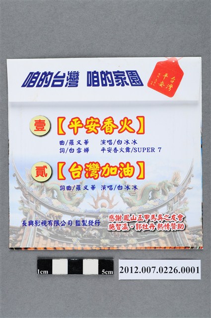 此為一紙質音樂CD套,為彩色印刷,標題為〈咱的家園,咱的家園〉,此平安香火音樂CD共二首歌曲,由白冰冰演唱,長興影視有限公司監製發行,鳳山五甲馬吳之友會施智瀛、郭牡丹贊助。 此物件為2012年第13任總統副總統選舉時中國國民黨候選人的相關宣傳品,此次選舉由代表中國國民黨的馬英九、吳敦義;代表民主進步黨的蔡英文、蘇嘉全;代表親民黨的宋楚瑜、林瑞雄參與選舉。代表國民黨的馬英九在競選中開設「臺灣加油讚」競選辦公室,並且以「不統不獨」的「兩岸」政策爭取選民選票。最終,代表國民黨的馬英九、吳敦義組合當選,馬英九成功連任第13任總統。