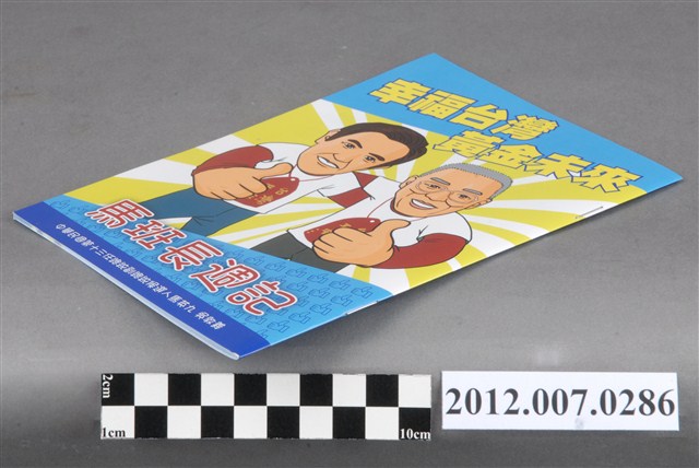 此物件為2012年第13任總統副總統選舉時中國國民黨候選人的相關宣傳品,此次選舉由代表中國國民黨的馬英九、吳敦義;代表民主進步黨的蔡英文、蘇嘉全;代表親民黨的宋楚瑜、林瑞雄參與選舉。代表國民黨的馬英九在競選中開設「臺灣加油讚」競選辦公室,並且以「不統不獨」的「兩岸」政策爭取選民選票。最終,代表國民黨的馬英九、吳敦義組合當選,馬英九成功連任第13任總統。
