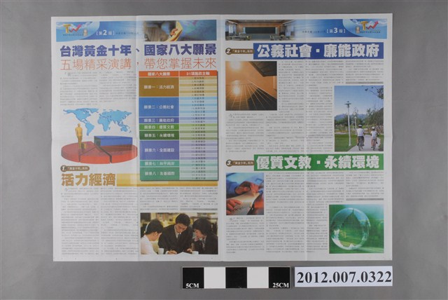 此為《TW―黃金十年臺灣升級促進會―會訊》第二期,採單張雙面報紙形式印刷,共計4個版面,內容要目計有〈產官學出馬相挺 黃金十年促進會成立〉、〈講師培訓團 如果如荼展開〉、〈黃金十年研習熱 從南臺灣出發〉、〈臺灣黃金十年、國家八大願景 五場精彩演講,帶您掌握未來〉、〈活力經濟〉、〈公義社會•廉能政府〉、〈優質文教•永續環境〉、〈全面建設〉、〈和平兩岸•友善國際〉。 「黃金十年台灣升級促進會」是呼應時任總統馬英九所提出之「黃金十年」政策所發起的民間組織,成立於2011年11月11日,其成員以產業、政治界人士為主,以推廣「黃金十年」政策理念並促進意見交流為目標。 「黃金十年」政策是時任總統馬英九在2011年為競選連任所提出的政策主張。與民進黨主席蔡英文在同期提出的「十年政綱」相較,有別於蔡英文鞏固臺灣本位、爭取國際認同,實踐公平正義的核心理念,馬英九的「黃金十年」政策聚焦在經濟發展和兩岸交流,以2010年簽訂的「兩岸經濟合作架構協議」(ECFA)為基調,在加強對中貿易往來的基礎上推動區域經濟整合。